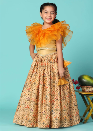 - Discover the charm of our orange top and lehenga set in cotton silk.