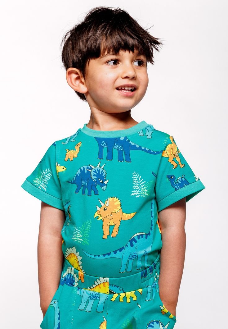 Dive into bold style with this dark teal printed T-shirt that captures the spirit of the ocean. Its rich color and cool design make it a statement piece for kids.