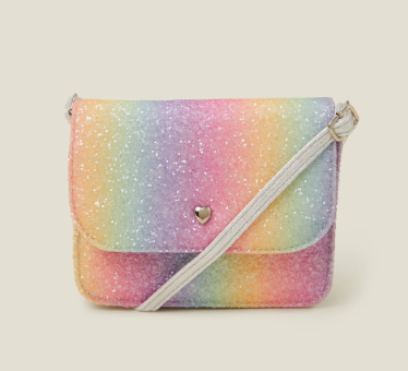 Rainbow sparkles… What more could you want? Doused in glittery rainbow ombre and a shiny metallic silver sheen, this mini bag is finished with a fold-over flap and adjustable strap for easy carrying.